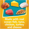 With Ocean Fish, Tuna & Cheese In Sauce: Water, Liver, Wheat Gluten, Meat By-Products, Ocean Fish, Chicken, Vegetable Starch-Modified, Soy Flour, Tuna, Cheese, Artificial And Natural Flavors, Sodium Caseinate, Tricalcium Phosphate, Vegetable Oil, Minerals [Potassium Chloride, Zinc Sulfate, Ferrous Sulfate, Manganese Sulfate, Copper Sulfate, Potassium Iodide], Corn Starch, Salt, Added Color, Dried Whey, Taurine, Choline Chloride, Vitamins [Thiamine Mononitrate (Vitamin B-1), Vitamin E Supplement, Niacin (Vitamin B-3), Calcium Pantothenate (Vitamin B-5), Vitamin A Supplement, Menadione Sodium Bisulfite Complex (Vitamin K), Pyridoxine Hydrochloride (Vitamin B-6), Riboflavin Supplement (Vitamin B-2), Vitamin B-12 Supplement, Biotin (Vitamin B-7), Folic Acid (Vitamin B-9), Vitamin D-3 Supplement], Red 3, Sorbic Acid (A Preservative). D617218; With Chicken & Cheese In Gravy: Water, Chicken, Liver, Wheat Gluten, Meat By-Products, Vegetable Starch-Modified, Soy Flour, Cheese, Artificial And Natural Flavors, Tricalcium Phosphate, Sodium Caseinate, Vegetable Oil, Corn Starch, Minerals [Potassium Chloride, Zinc Sulfate, Ferrous Sulfate, Manganese Sulfate, Copper Sulfate, Potassium Iodide], Added Color, Salt, Dried Whey, Taurine, Choline Chloride, Vitamins [Thiamine Mononitrate (Vitamin B-1), Vitamin E Supplement, Niacin (Vitamin B-3), Calcium Pantothenate (Vitamin B-5), Vitamin A Supplement, Menadione Sodium Bisulfite Complex (Vitamin K), Pyridoxine Hydrochloride (Vitamin B-6), Riboflavin Supplement (Vitamin B-2), Vitamin B-12 Supplement, Biotin (Vitamin B-7), Folic Acid (Vitamin B-9), Vitamin D-3 Supplement], Sorbic Acid (A Preservative). D617018; With Turkey & Cheese In Gravy: Water, Turkey, Liver, Wheat Gluten, Meat By-Products, Vegetable Starch-Modified, Soy Flour, Artificial And Natural Flavors, Cheese, Sodium Caseinate, Vegetable Oil, Minerals [Potassium Chloride, Zinc Sulfate, Ferrous Sulfate, Manganese Sulfate, Copper Sulfate, Potassium Iodide], Added Color, Tricalcium Phosphate, Corn Starch, Salt, Dried Whey, Taurine, Choline Chloride, Vitamins [Thiamine Mononitrate (Vitamin B-1), Vitamin E Supplement, Niacin (Vitamin B-3), Calcium Pantothenate (Vitamin B-5), Vitamin A Supplement, Menadione Sodium Bisulfite Complex (Vitamin K), Pyridoxine Hydrochloride (Vitamin B-6), Riboflavin Supplement (Vitamin B-2), Vitamin B-12 Supplement, Biotin (Vitamin B-7), Folic Acid (Vitamin B-9), Vitamin D-3 Supplement], Sorbic Acid (A Preservative).
