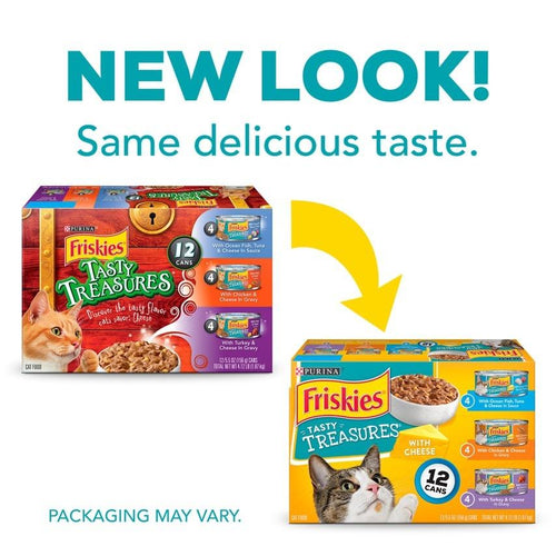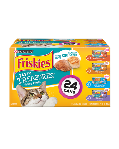 Stock your pantry with this Purina Friskies Tasty Treasures wet cat food variety pack, and give your cat mealtime options that provide 100% complete and balanced nutrition for adult cats. This variety pack contains Tasty Treasures With Ocean Fish, Tasty Treasures With Tuna & Cheese, and Tasty Treasures With Turkey & Cheese, delivering the poultry and seafood flavors she adores. She'll love the sprinkles of cheese flavor in every savory bite, and you can feel good about feeding her these recipes thanks to the essential vitamins and minerals found in every serving. With 12 cans in each package, this variety pack ensures you always have something delectable to pour into her dish. For even more variety in your cat's diet, alternate between these wet cat food recipes and our Purina Friskies Tender & Crunchy Combo dry cat food. You want to know your cat is getting safe, delicious and nutritious meals, which is why we formulate this collection of wet cat foods to meet or exceed industry standards. We strive to make quality the number one ingredient in everything we produce. That's why each batch of this wet canned food undergoes rigorous quality and safety checks throughout every step in the production process, so you can feel confident every time you open a can of Purina Friskies Tasty Treasures. Sustainability, too, is a core concept at Purina, and we see our commitment through by seeking out responsibly sourced ingredients and eco-friendly packaging options. Each can of this wet cat food, along with the carton, is recyclable, so your purchases can have a positive impact on the world around you. Show your cat how much you care about her happiness and well-being when you feed her Purina Friskies Tasty Treasures wet cat food, and watch as she nibbles every last delectable morsel.